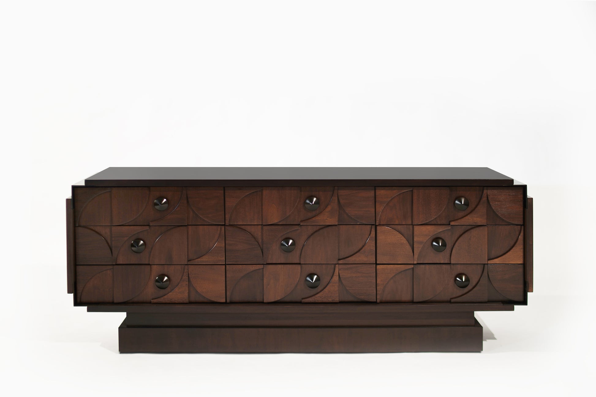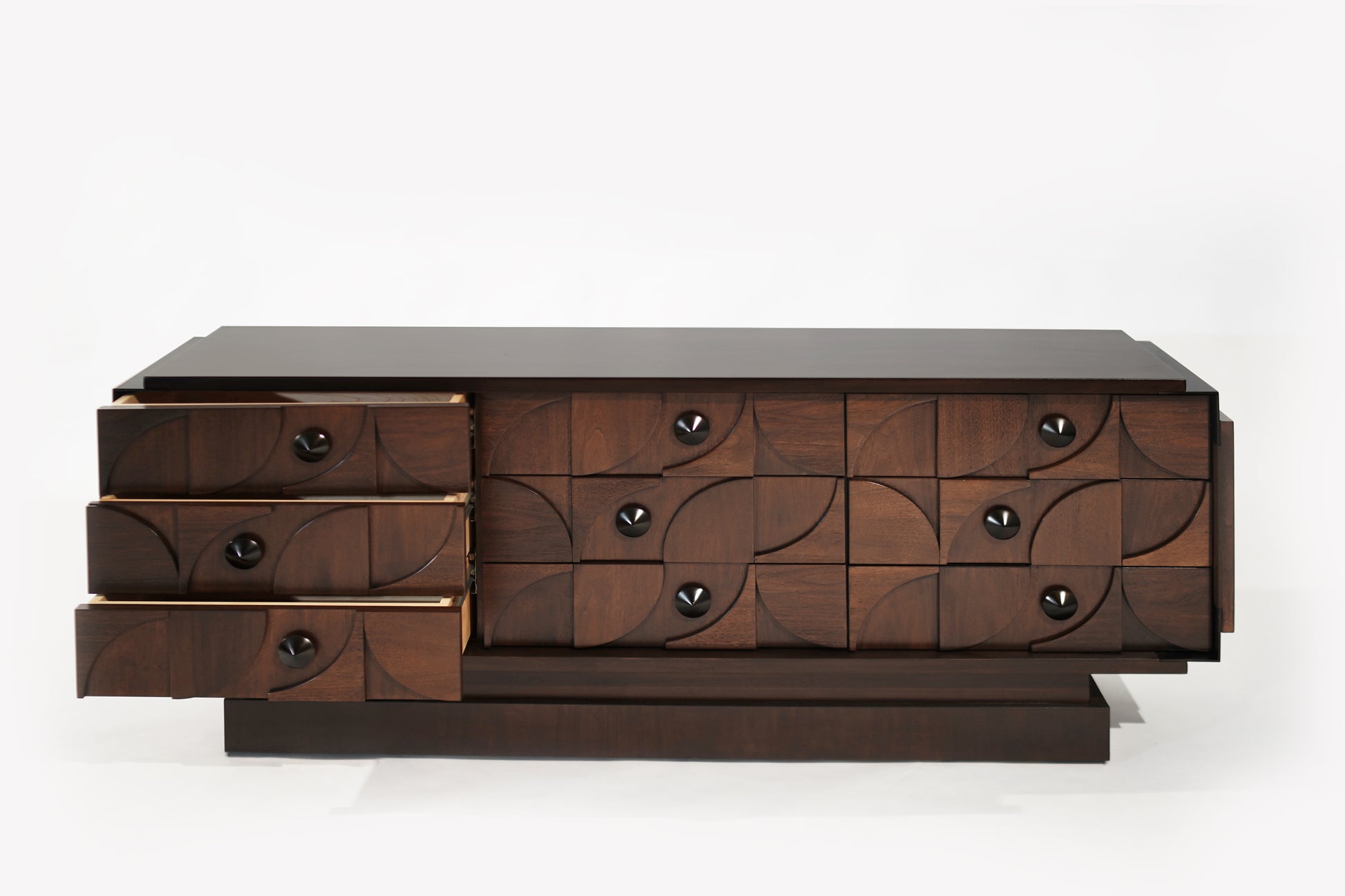This striking Brutalist-style dresser showcases a masterful execution in walnut, highlighted by unique ORB accent corners and hardware. The piece features nine spacious drawers, offering ample storage while enhancing its bold aesthetic. Meticulously restored to its original splendor, this dresser combines robust design with functional elegance, making it a standout addition to any interior.