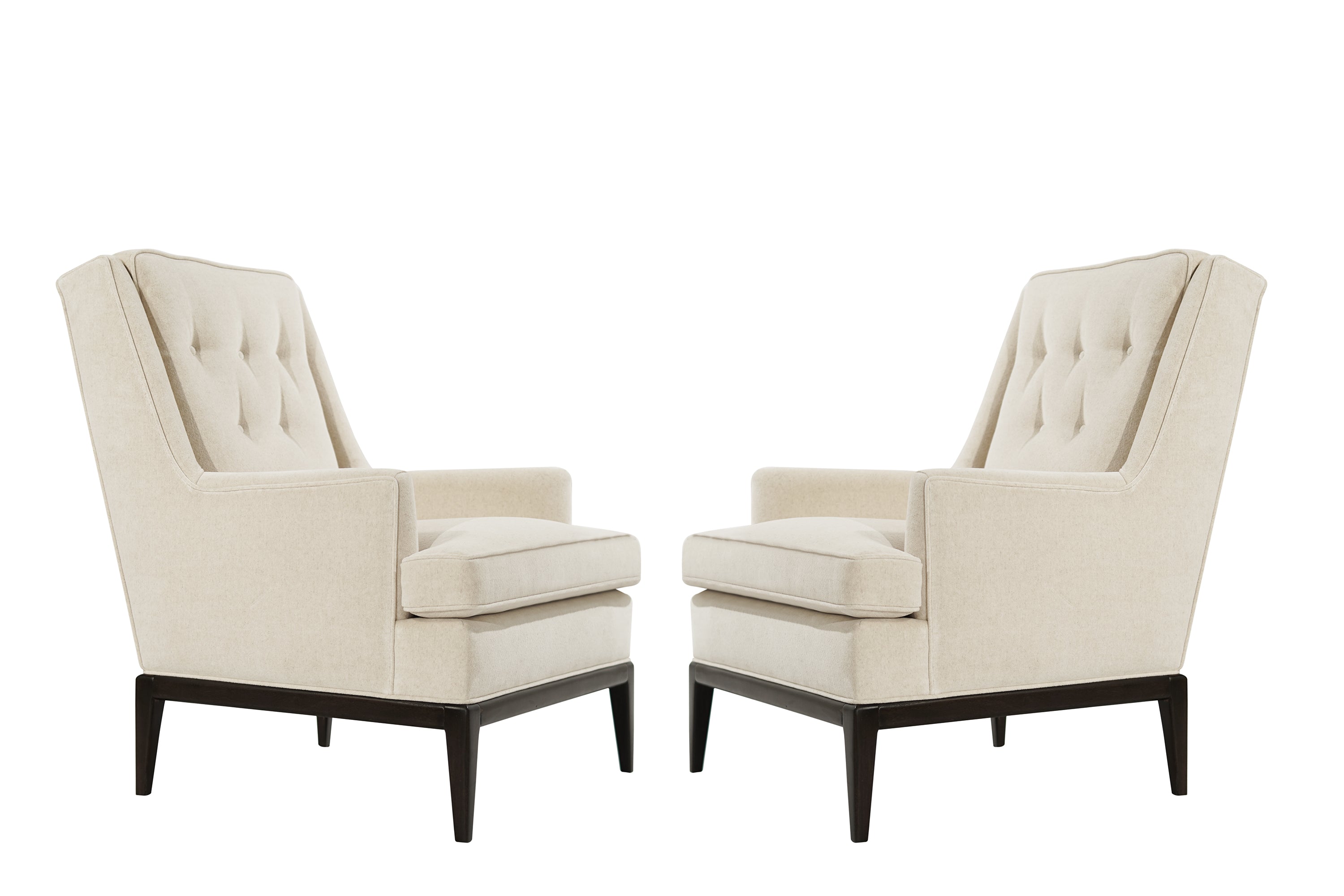 Set of highback lounge chairs designed by T.H. Robsjohn-Gibbings for Widdicomb, circa 1950-1959. Completely restored, walnut base redone in our dark walnut finish. Reupholstered in off-white high-grade wool by Holly Hunt.