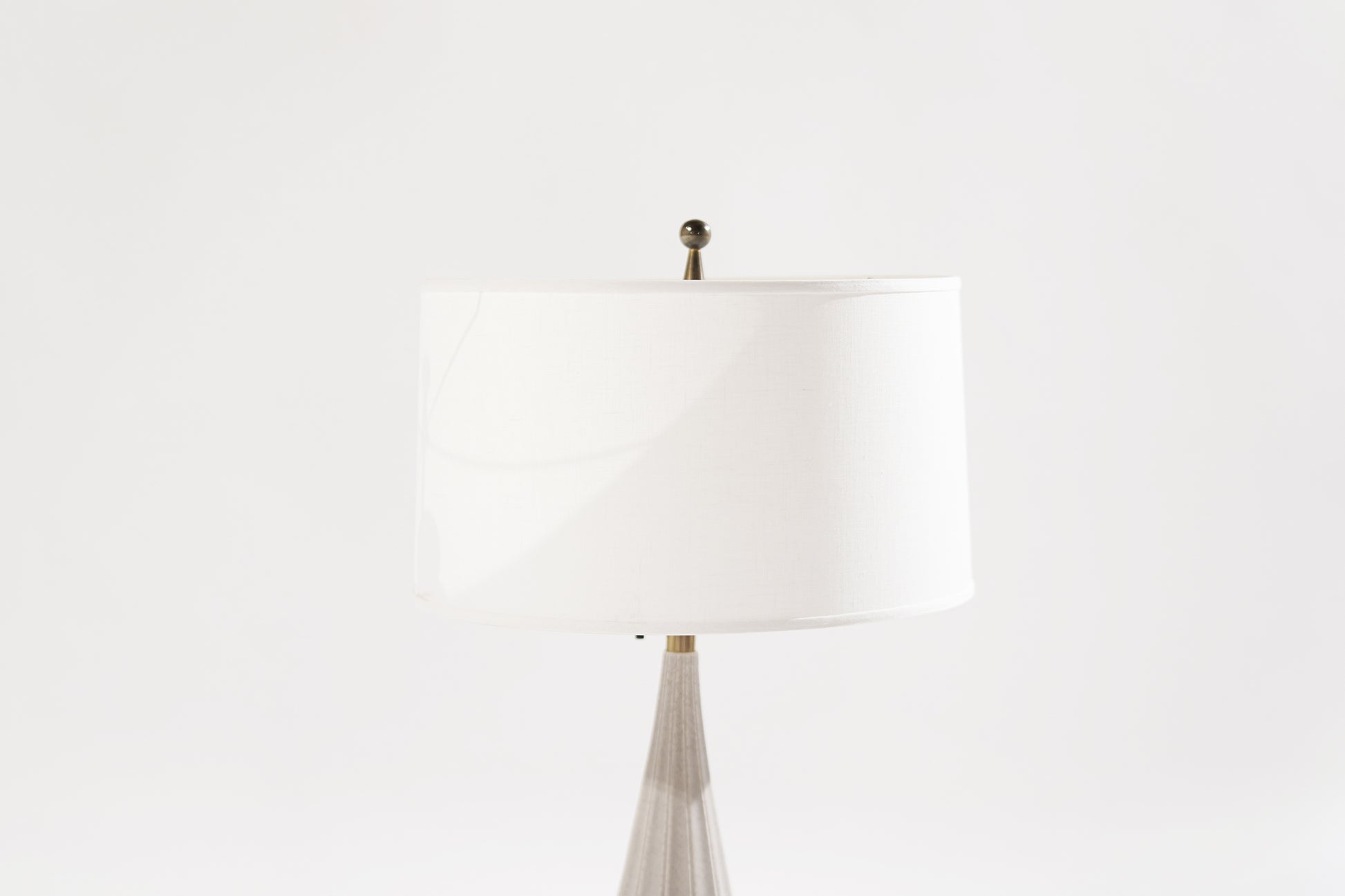Speckled porcelain and brass table lamp designed by Gerald Thurston for Lightiolier, circa 1950-1959. Completely rewired, newly white linen shade included.