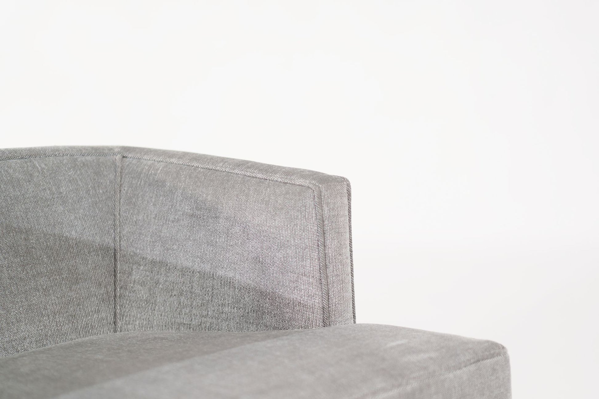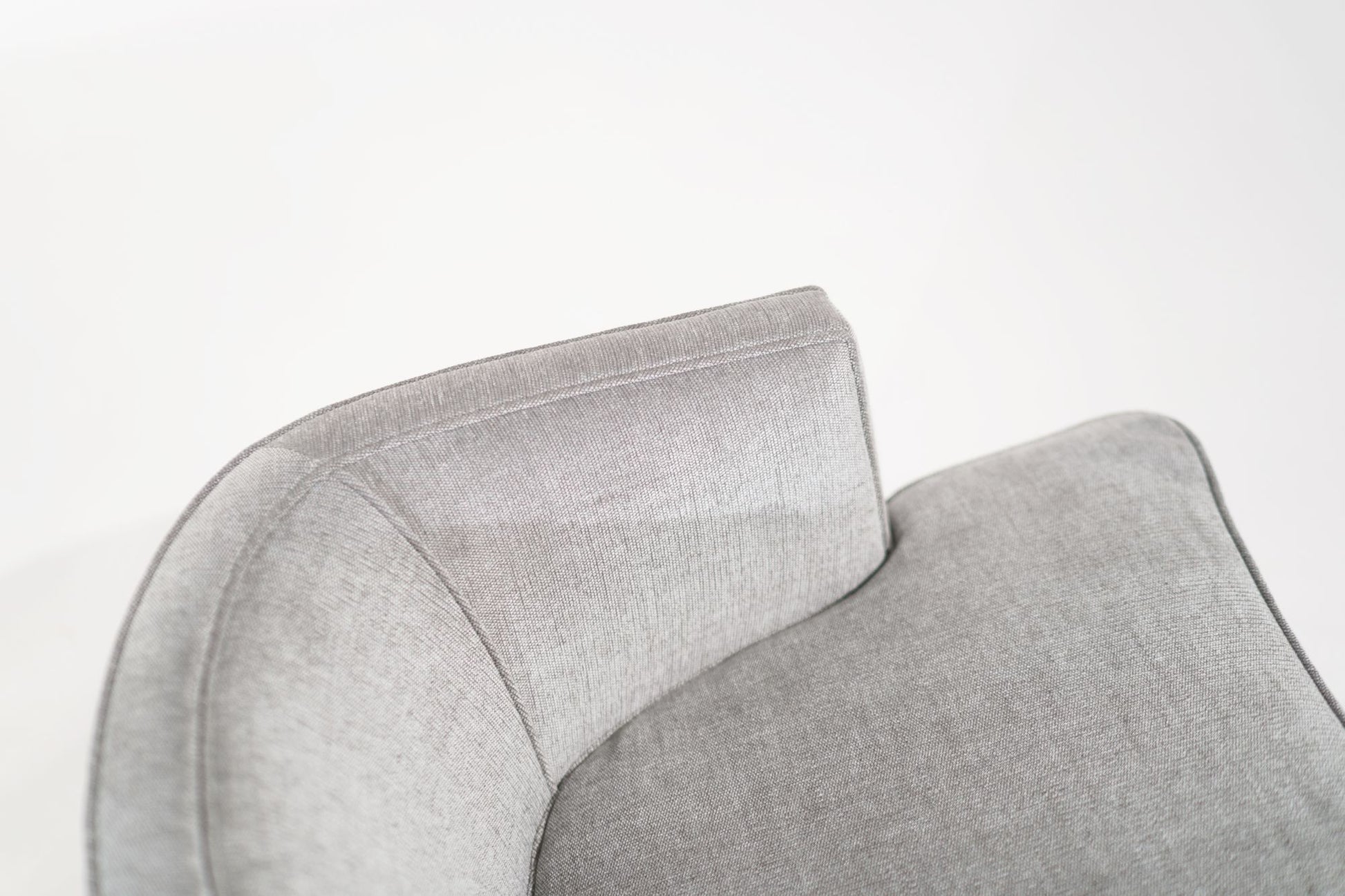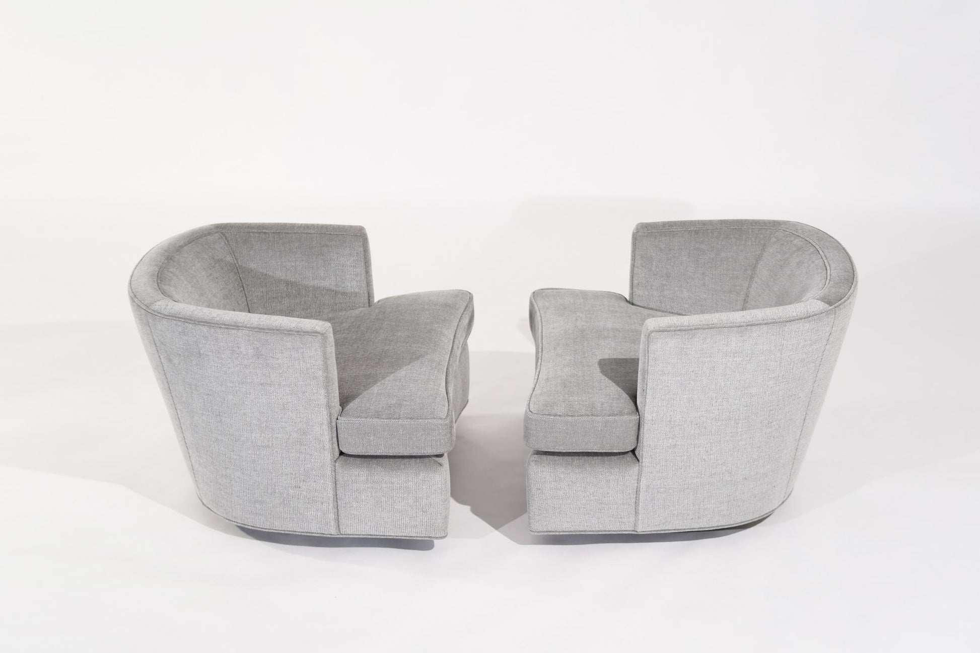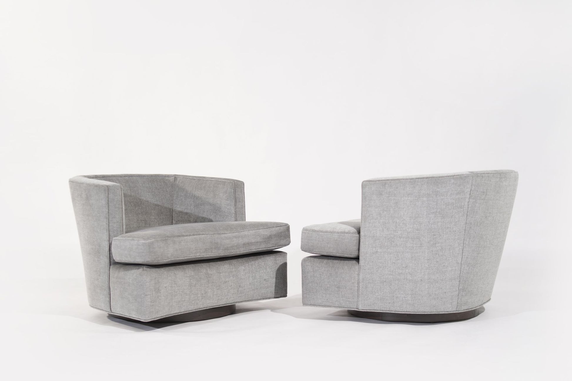 A timeless pair of swivel chairs, designed by the iconic Harvey Probber in the 1950s and brought back to life by Stamford Modern through a comprehensive restoration process. These chairs showcase the epitome of mid-century sophistication, exuding an understated elegance that seamlessly integrates into any contemporary space. Impeccably reupholstered in luxurious grey twill by Holly Hunt, the chairs not only offer a touch of modern refinement but also ensure comfort with their swiveling functionality. The distinctive concave front and low-profile silhouette add a touch of architectural flair, making them a statement piece that effortlessly combines vintage charm with contemporary sensibility.