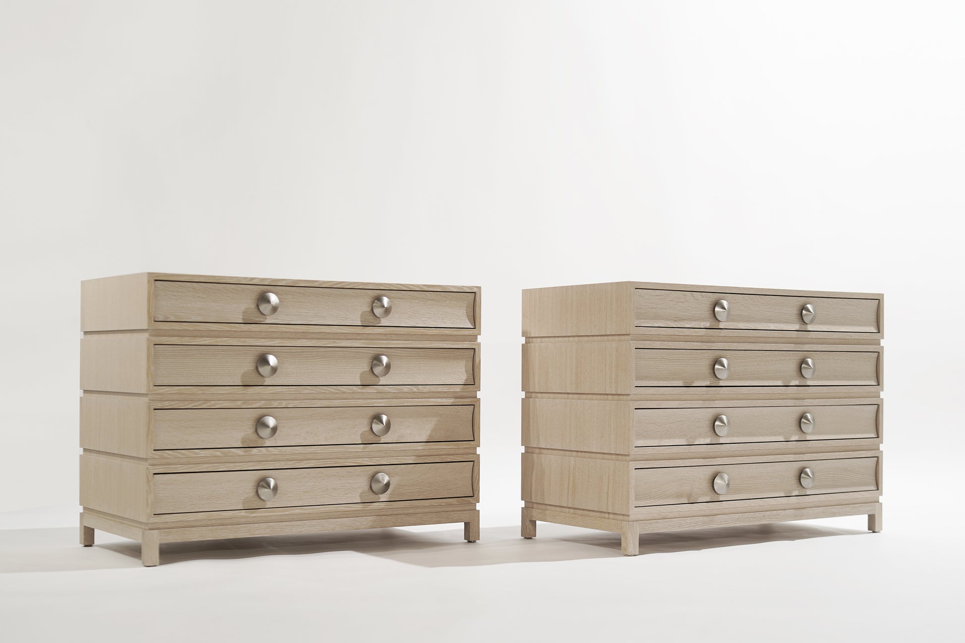 Inspired by the iconic designer Paul Frankl, these rustic modern dressers blend timeless elegance with contemporary flair. The oversized drawer frames and subtly curved fronts create a playful asymmetry, while notched sides add a unique touch, forming intriguing squares of negative space. The drawers, made from solid oak with dovetail joinery, exemplify exceptional craftsmanship and durability. The large dome-shaped brushed-nickel drawer pulls further enhance the tables' allure, reflecting light in captivating ways. Crafted from oak and showcasing a stunning limed oak finish, these dressers are testament to meticulous craftsmanship and exquisite design.