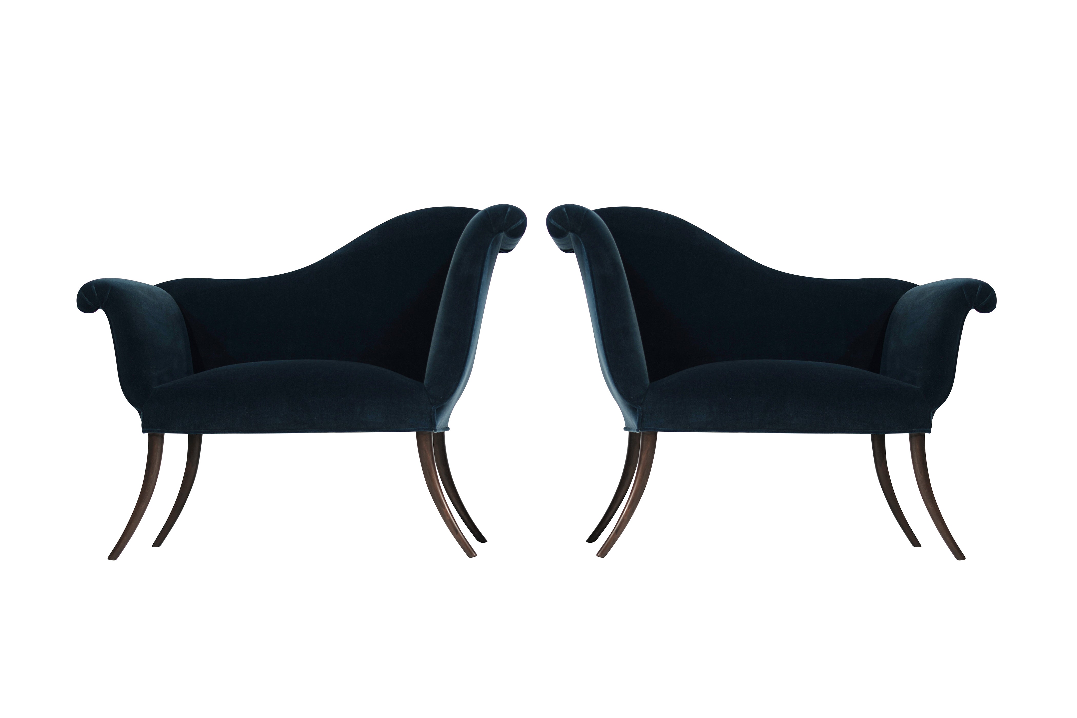 Presenting a set of Neoclassical Style settees attributed to T.H. Robsjohn-Gibbings, circa 1940s. Fully restored, these elegant, unique pieces are reupholstered in luxurious aqua mohair, bringing a fresh pop of color. Their signature mahogany Klismos legs, expertly refinished in a rich dark stain, enhance the timeless appeal of these rare and refined settees.