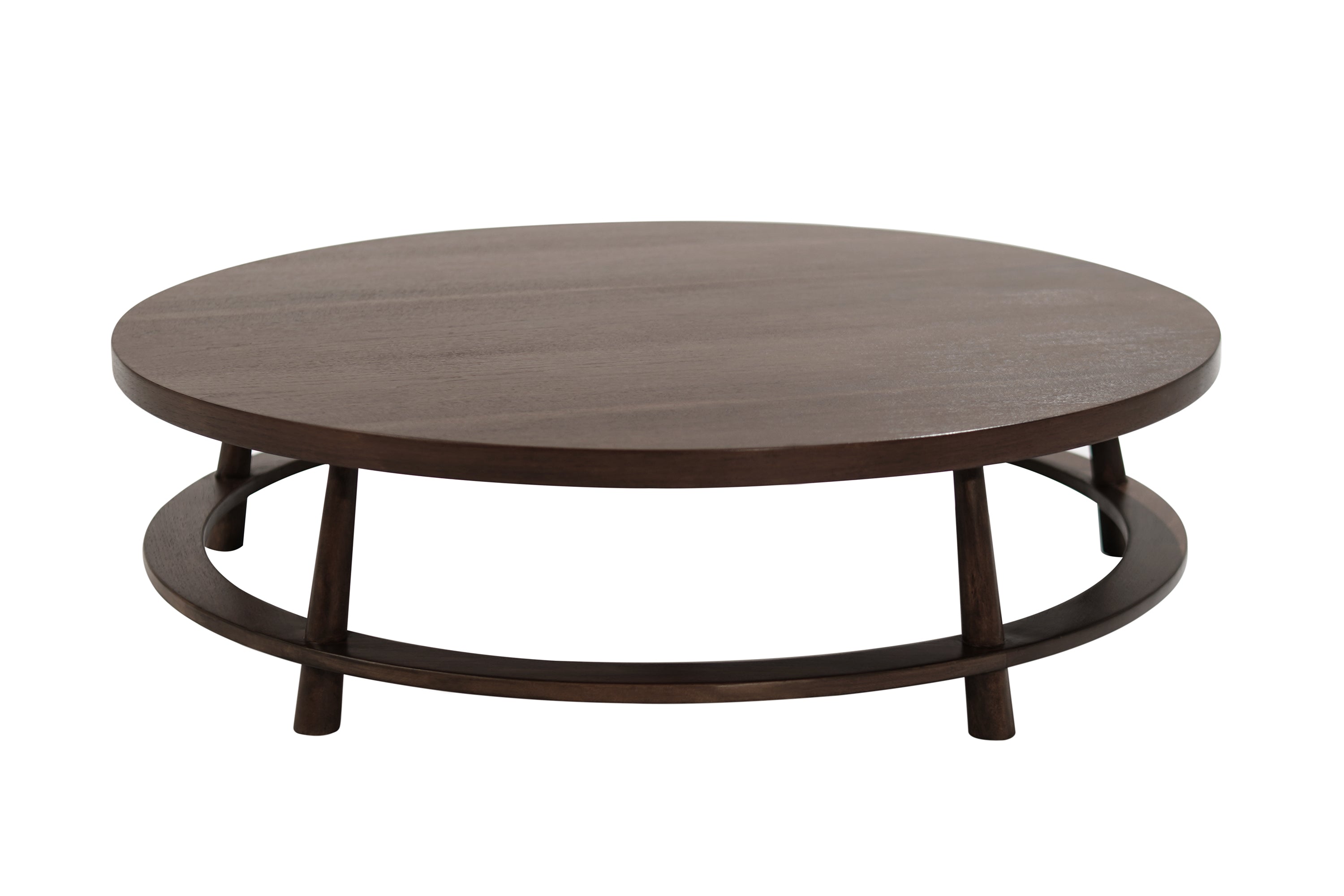 Stunning low profile 48" round cocktail or coffee table executed in walnut designed by T.H. Robsjohn-Gibbings for The Widdicomb Furniture Company, Grand Rapids, MI, circa 1950s. Completely restored.