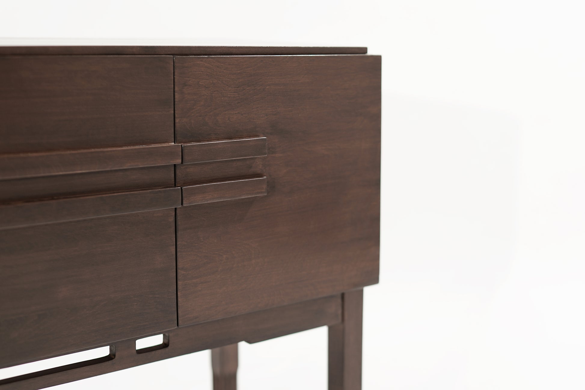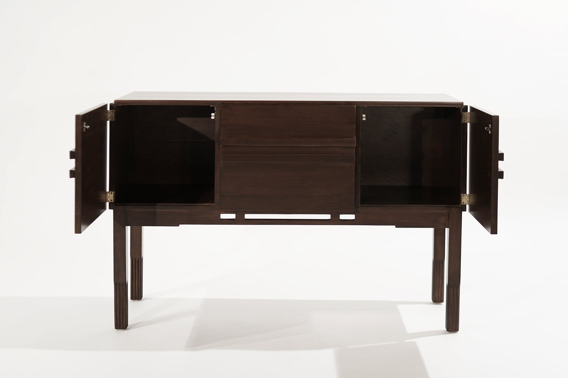 A console table executed in walnut by John Stuart, circa 1950-1959. Completely restored, featuring two drawers and side doors that open up to reveal shelving.
