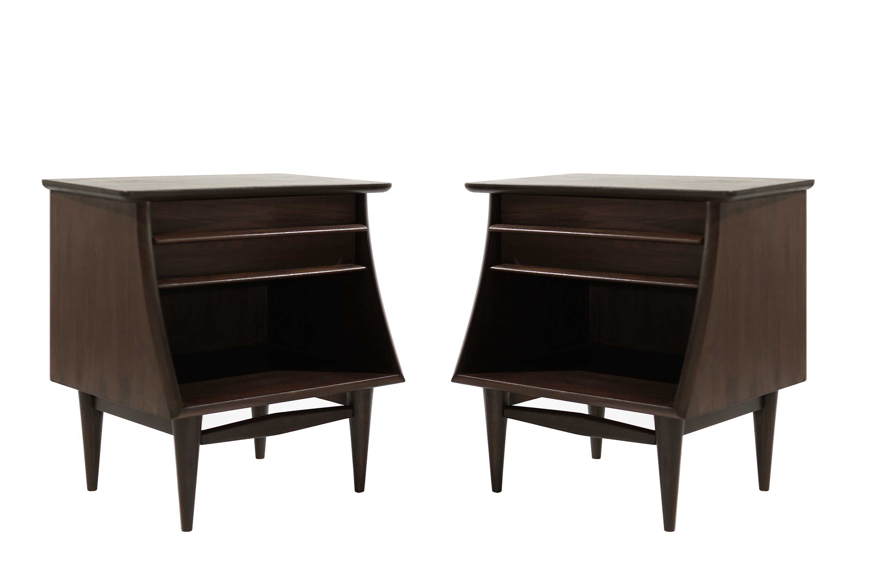 Set of end tables by Kent Coffey, circa 1950s. Executed in walnut, featuring sculptural forms and drawer and shelving for storage. Completely restored.